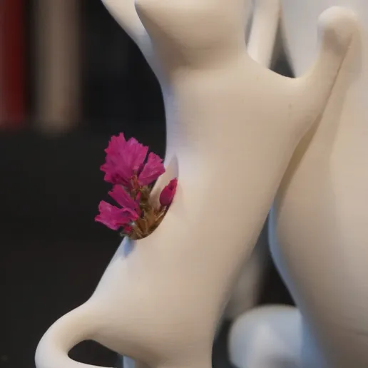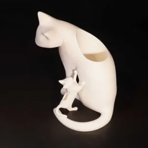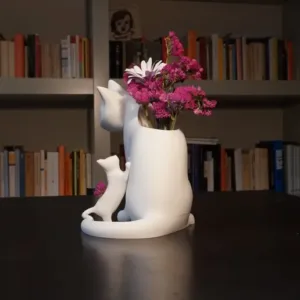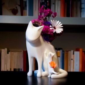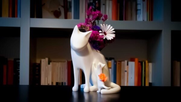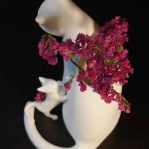 يُبرز التصميم البسيط الطبيعة الهادئة واللطيفة لأم القطة، ممزوجةً بقط صغير مرح، مُعززًا بجمال الزهور الطبيعية المُضافة.